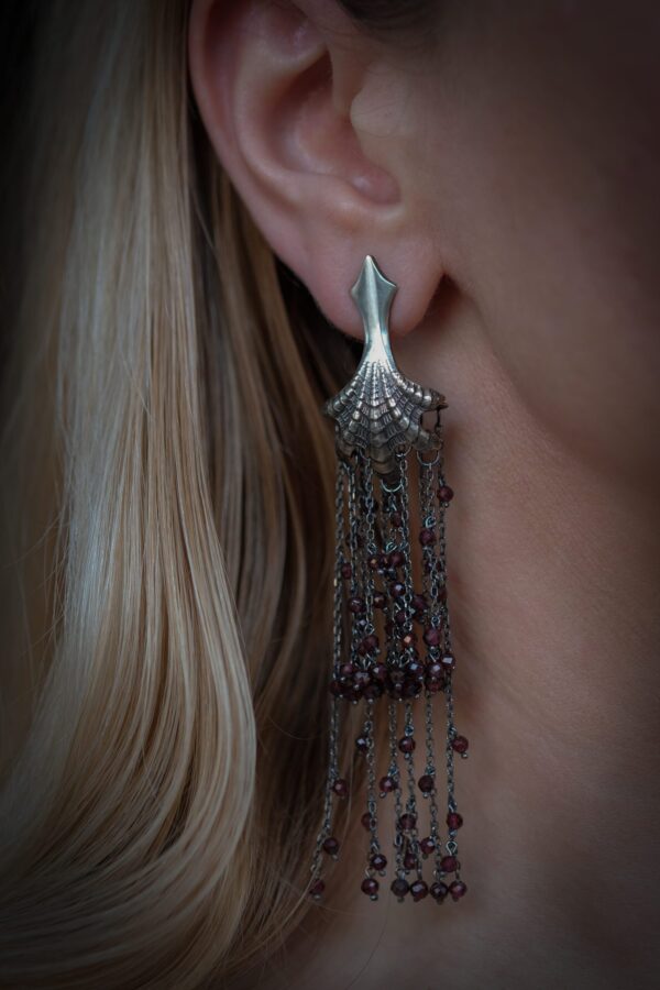 Küüniste ja sädelevate granaatidega kõrvarõngad peegeldavad müstilisust ja nõiduslikkust. Pilkupüüdvad kõrvarõngad on ainueksemplarid, mis sisaldavad antiikseid detaile. Sobivad hästi kandmiseks erilistel puhkudel, kuuludes pigem raskemate kõrvarõngaste hulka. Üks paar saadaval.