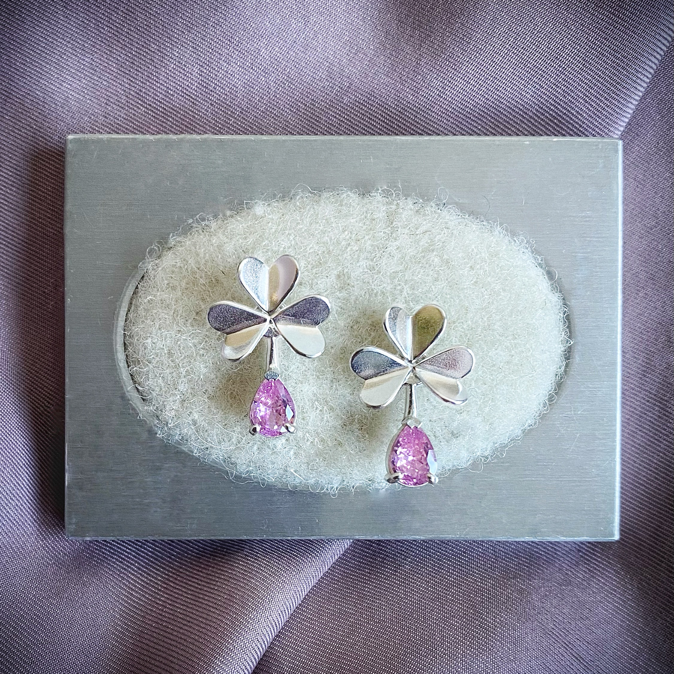 Hõbedast käsitsivalmistatud ristikheinalehed on ruumilised ja mängivad kaunilt valguse käes peegeldades erinevaid nurki. Hõbedast väikseid lehekesi täiendab särav-roosa kivi.