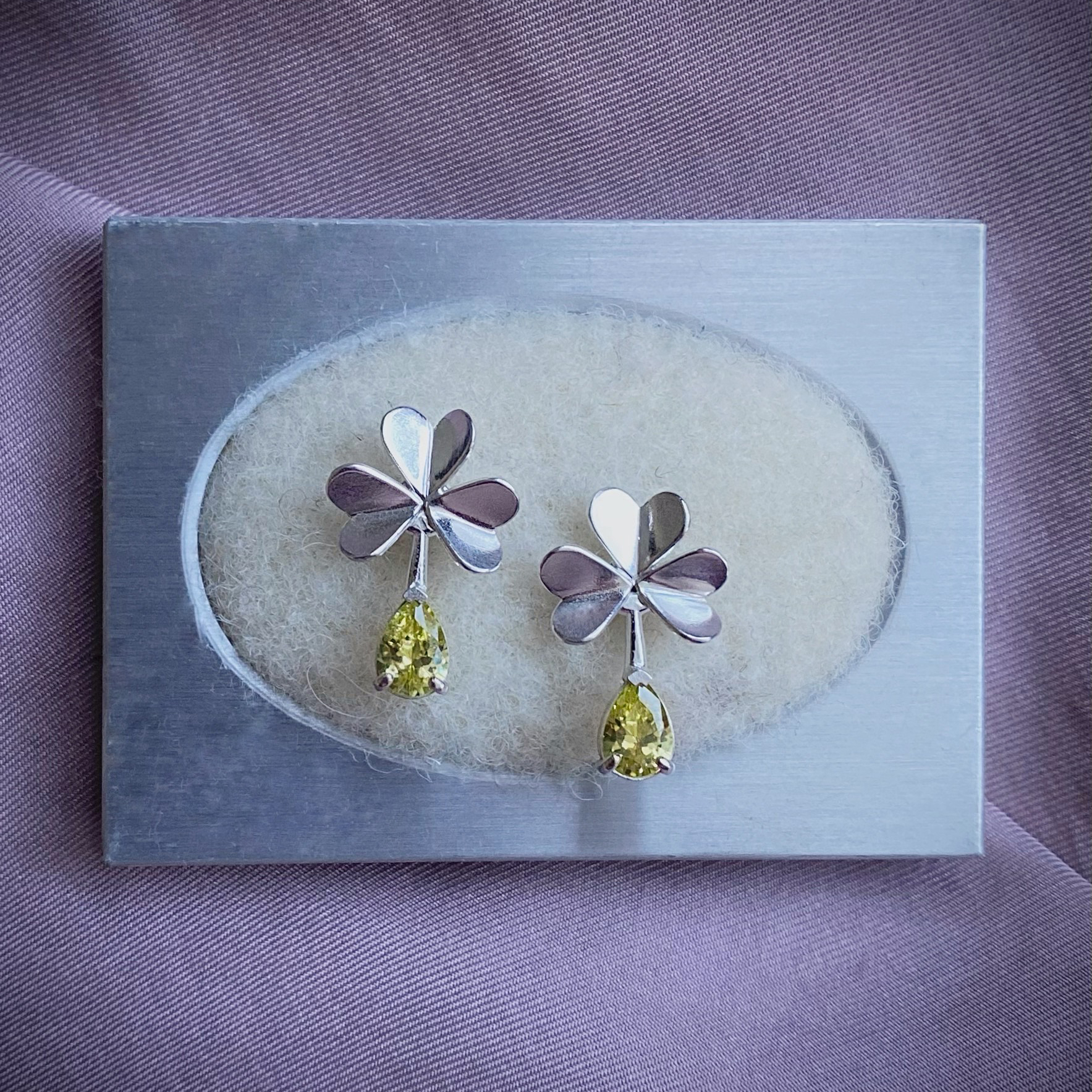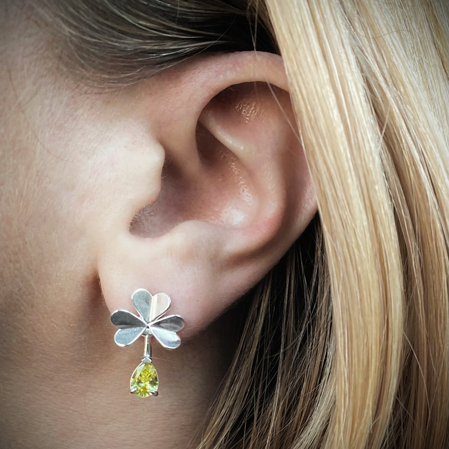 Hõbedast käsitsivalmistatud ristikheinalehed on ruumilised ja mängivad kaunilt valguse käes peegeldades erinevaid nurki. Hõbedast väikseid lehekesi täiendab särav-kollane kivi.