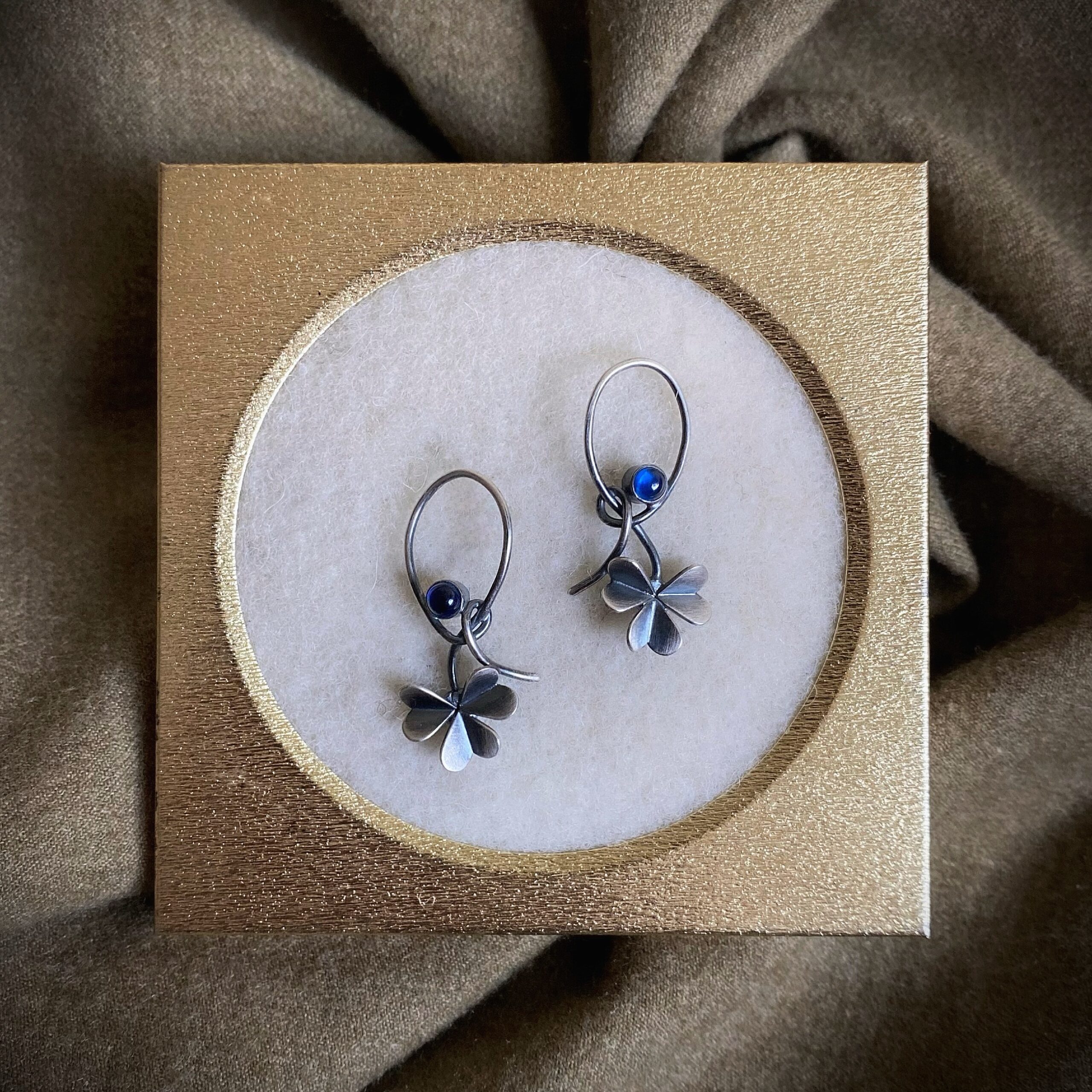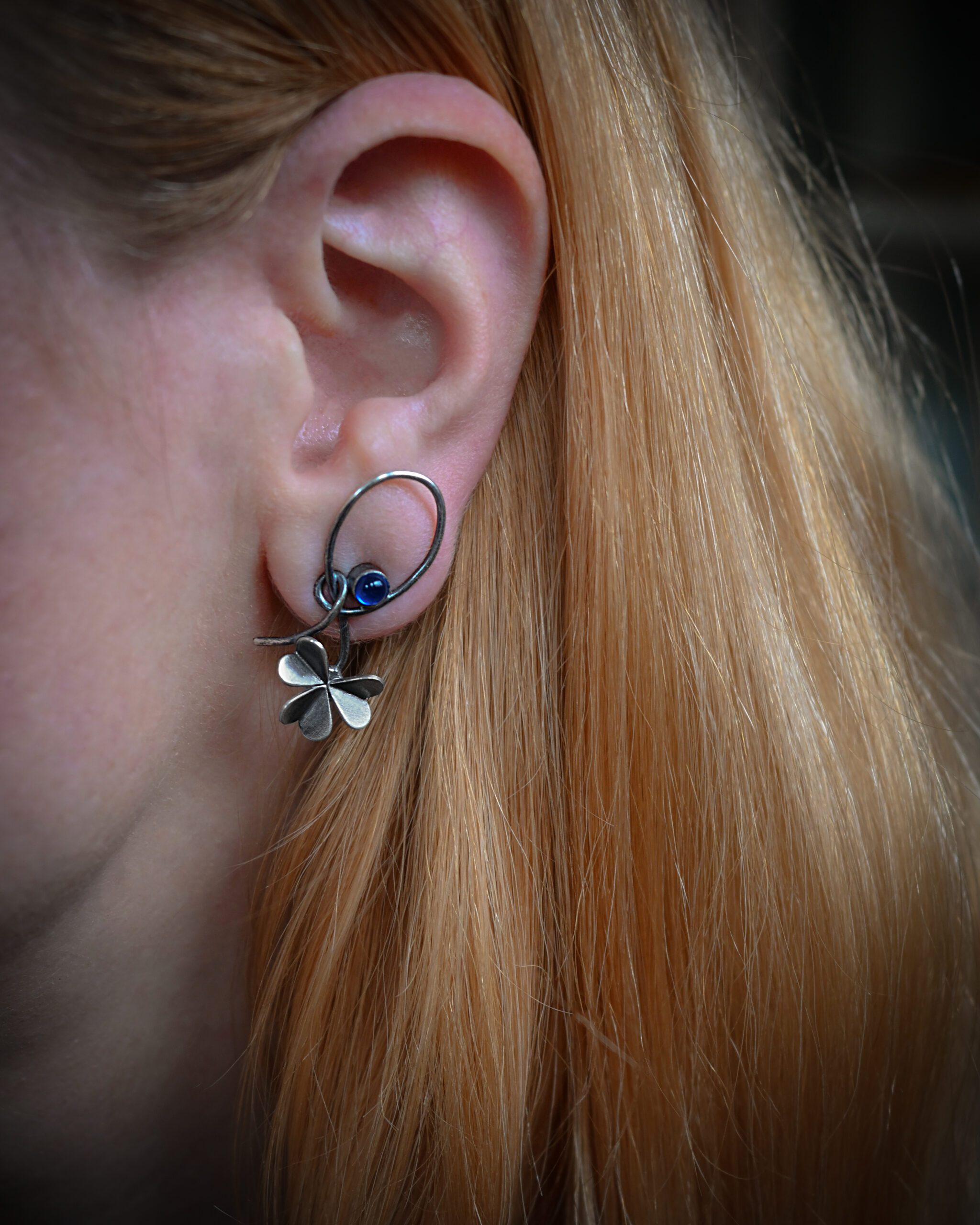 Hõbedast käsitsivalmistatud ristikheinalehed on ruumilised ja mängivad kaunilt valguse käes peegeldades erinevaid nurki. Elegantseid sõlmekeeratud ristikheina lehti kaunistavad sügavsinised cabachon lihvis kivid.