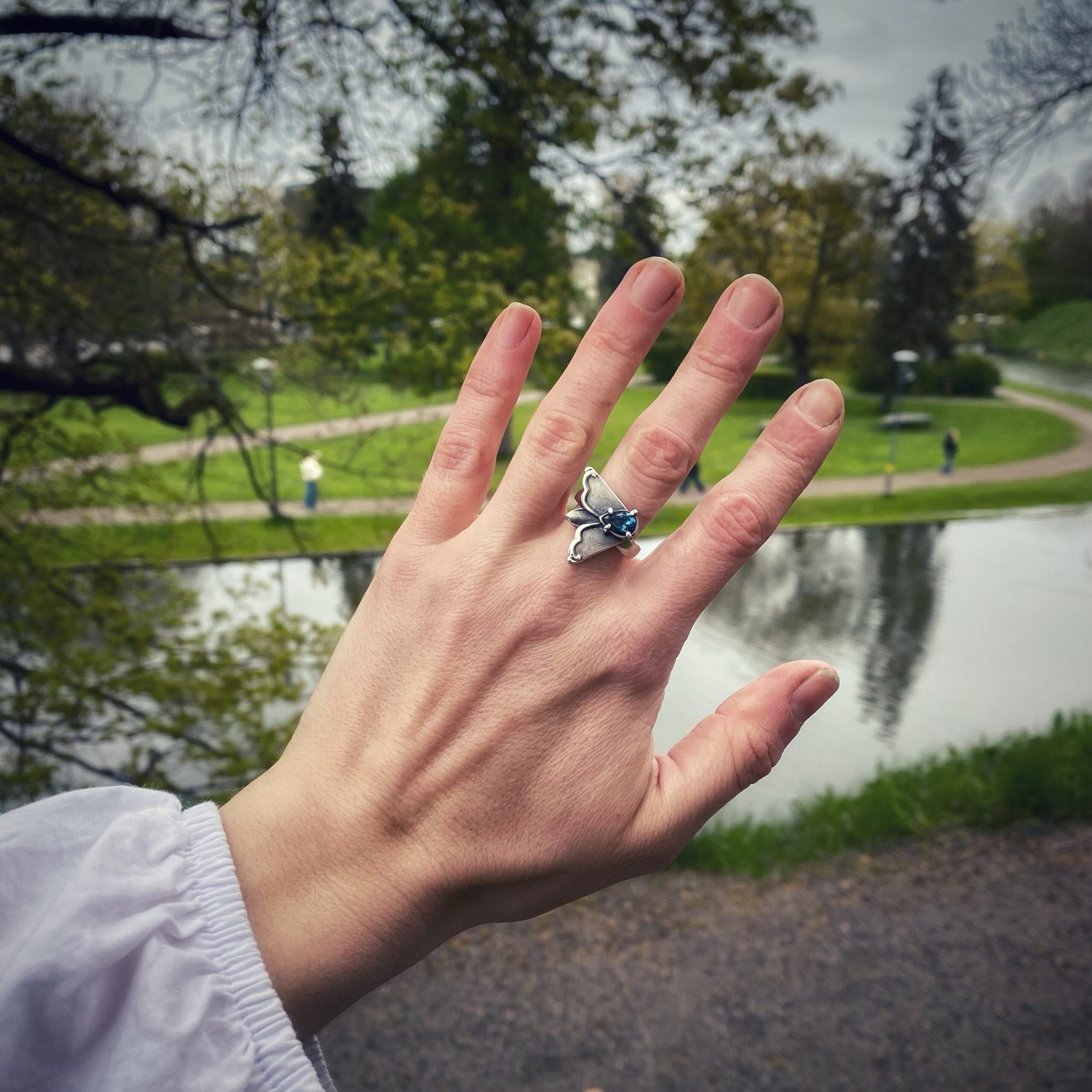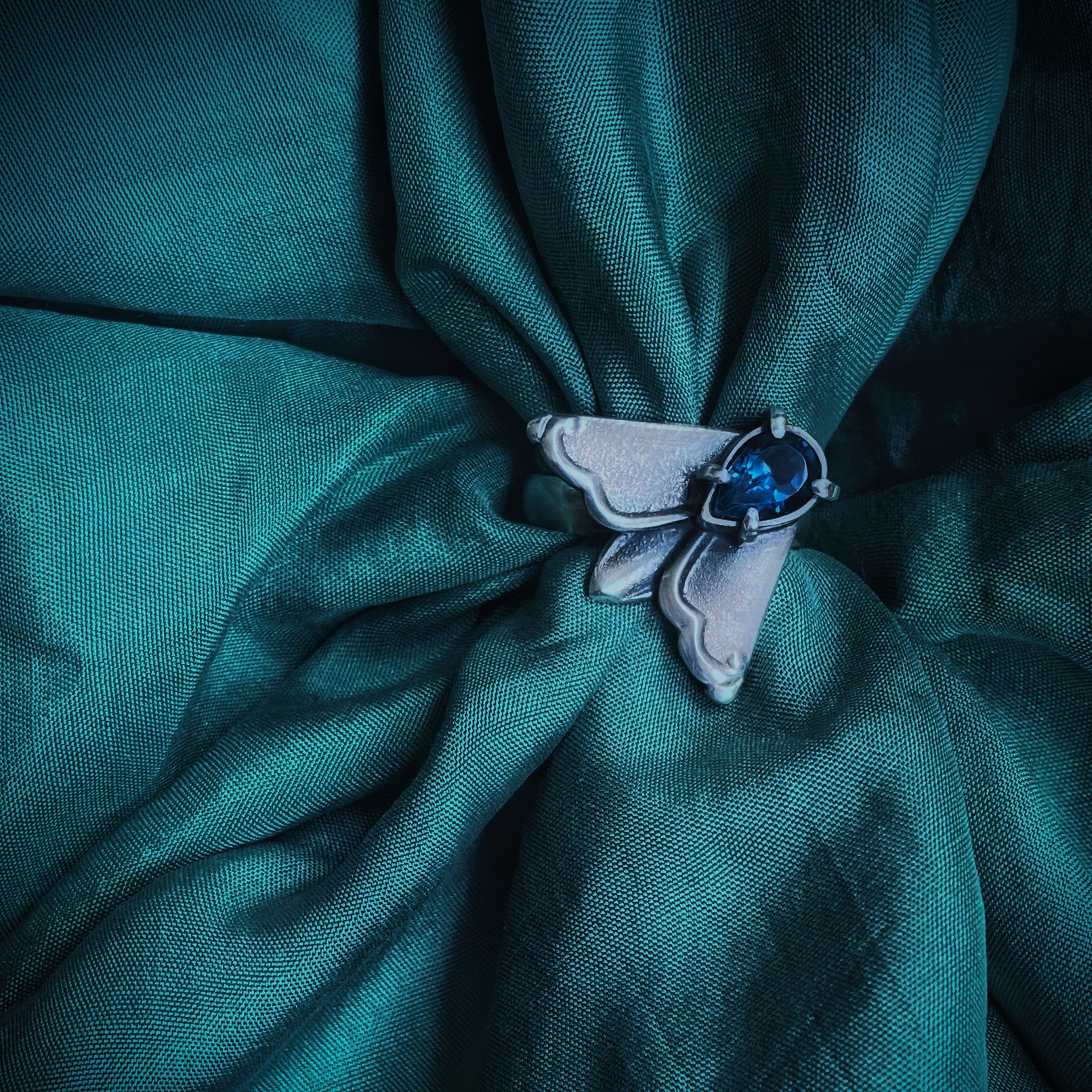Seda ainueksemplarist ööliblikaga sõrmust ehivad antiiksete ornamentidega tiivad ning sügava tooniga naturaalne topaas. Antiik-hõbedast elemendid on leidnud uue elu läbi kunstniku nägemuse. Need ehted on trendide ja hooaegade ülesed kandes endas nii mineviku igavikulikkust kui ka tänapäevast tõlgendust. Saadaval üks sõrmus suuruses 17.