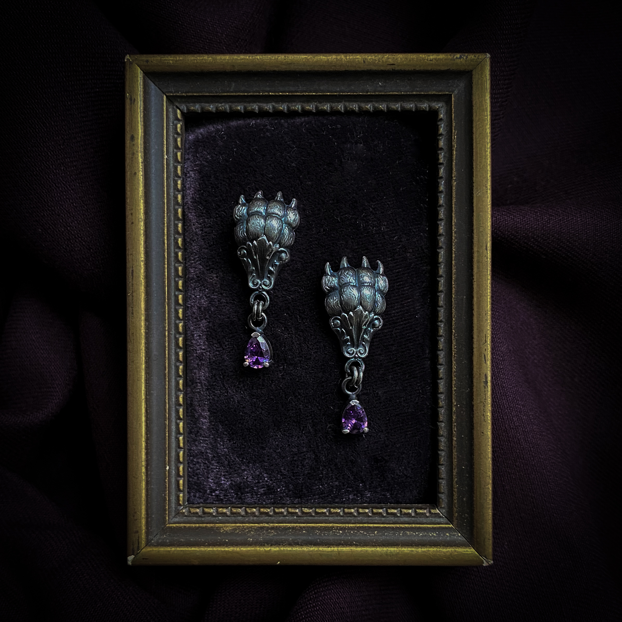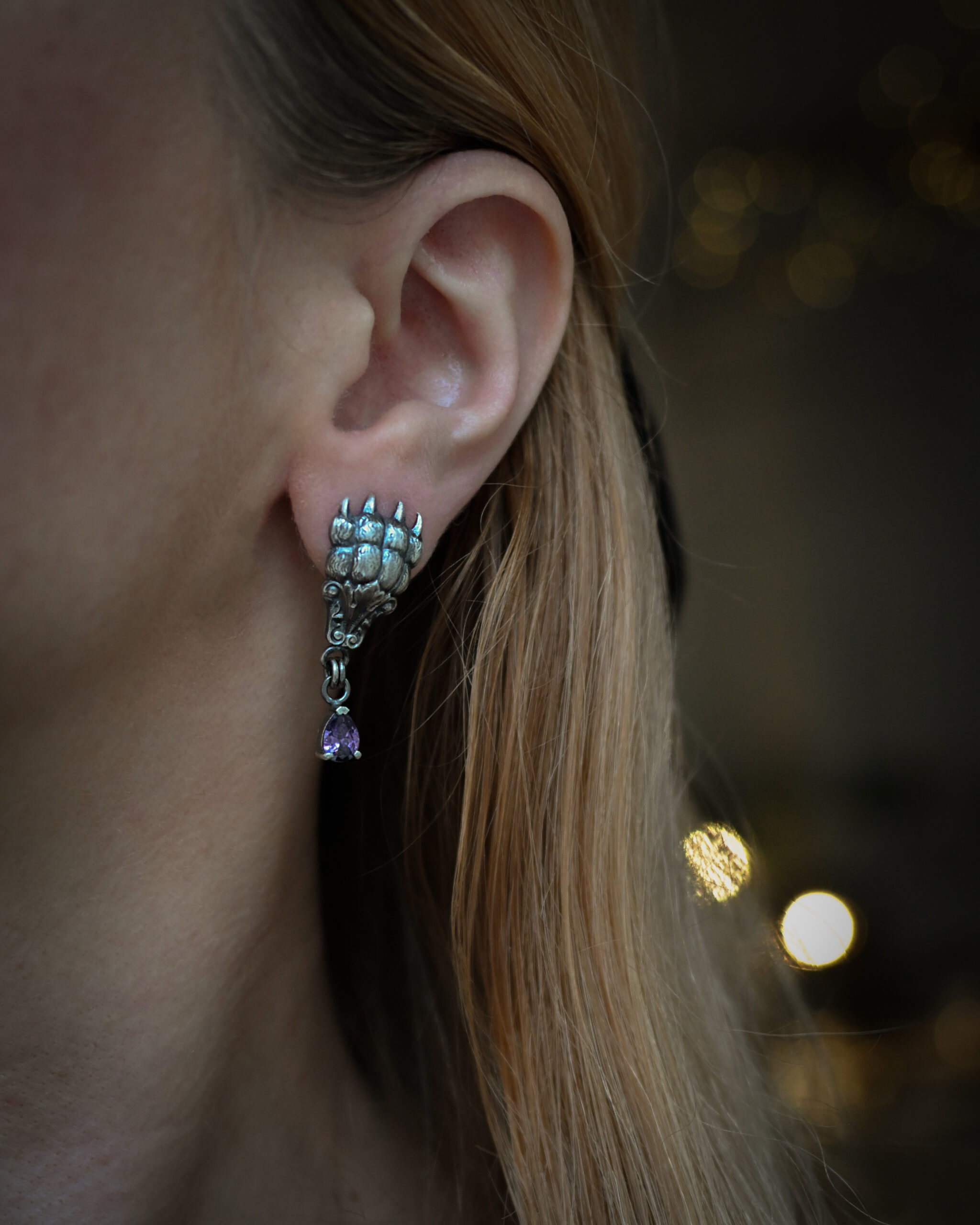 Käppade ja lilla kiviga kõrvarõngad seeriast ‘Igaviku Sosinad’