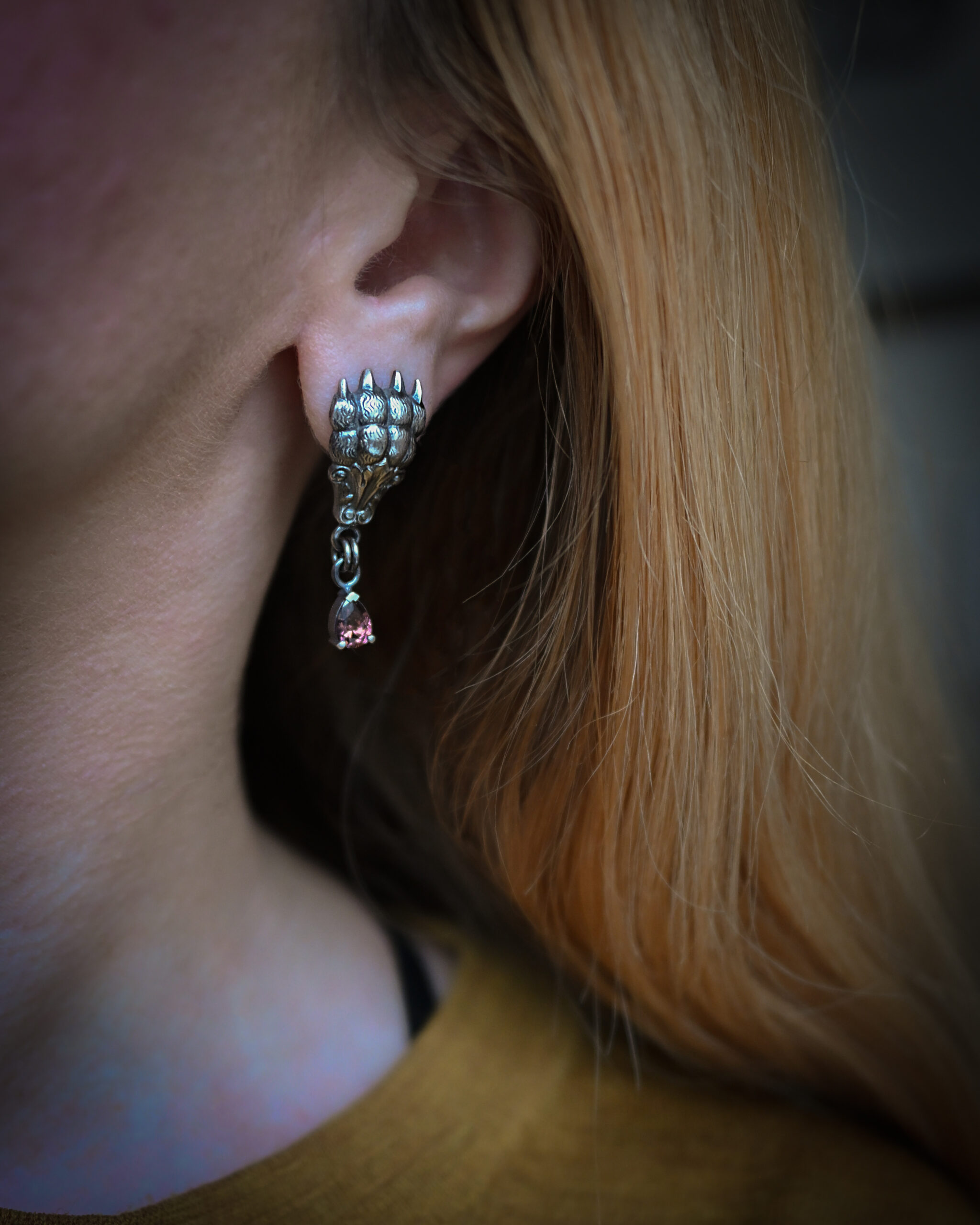 Müstilised ja magnetiliselt kutsuvad kõrvarõngad, mis kannavad endas suursugusust. Need kaslase käppadega kõrvarõngad on julgustavaks talismaniks olulistel hetkedel ning samas piisavalt mugavad, et vaikse, ent valvel oleva kiskja kohalolekuga toetada sind iga päev. Käsitsi valmistatud hõbedast ehteid täiendab suitsuse merlot toonis cubic zirconia.