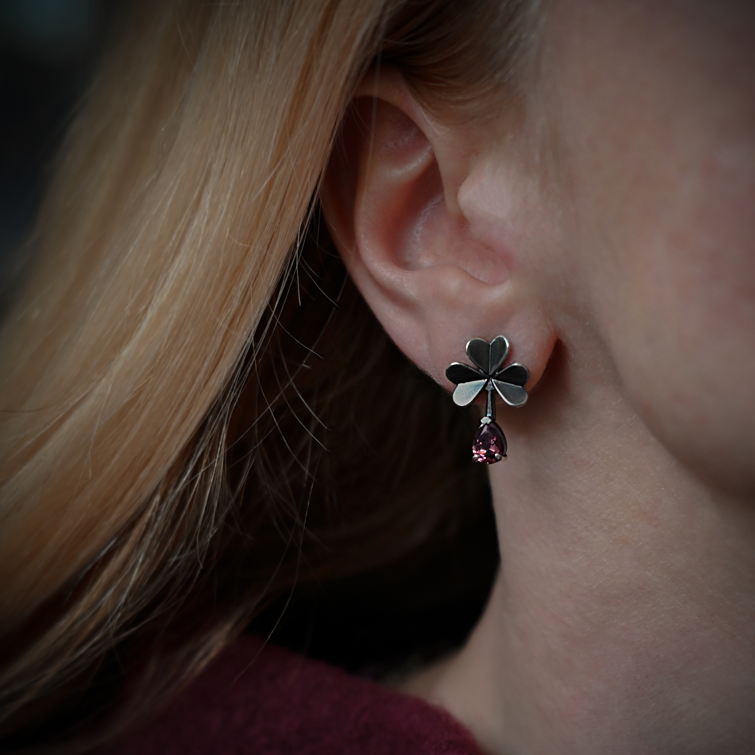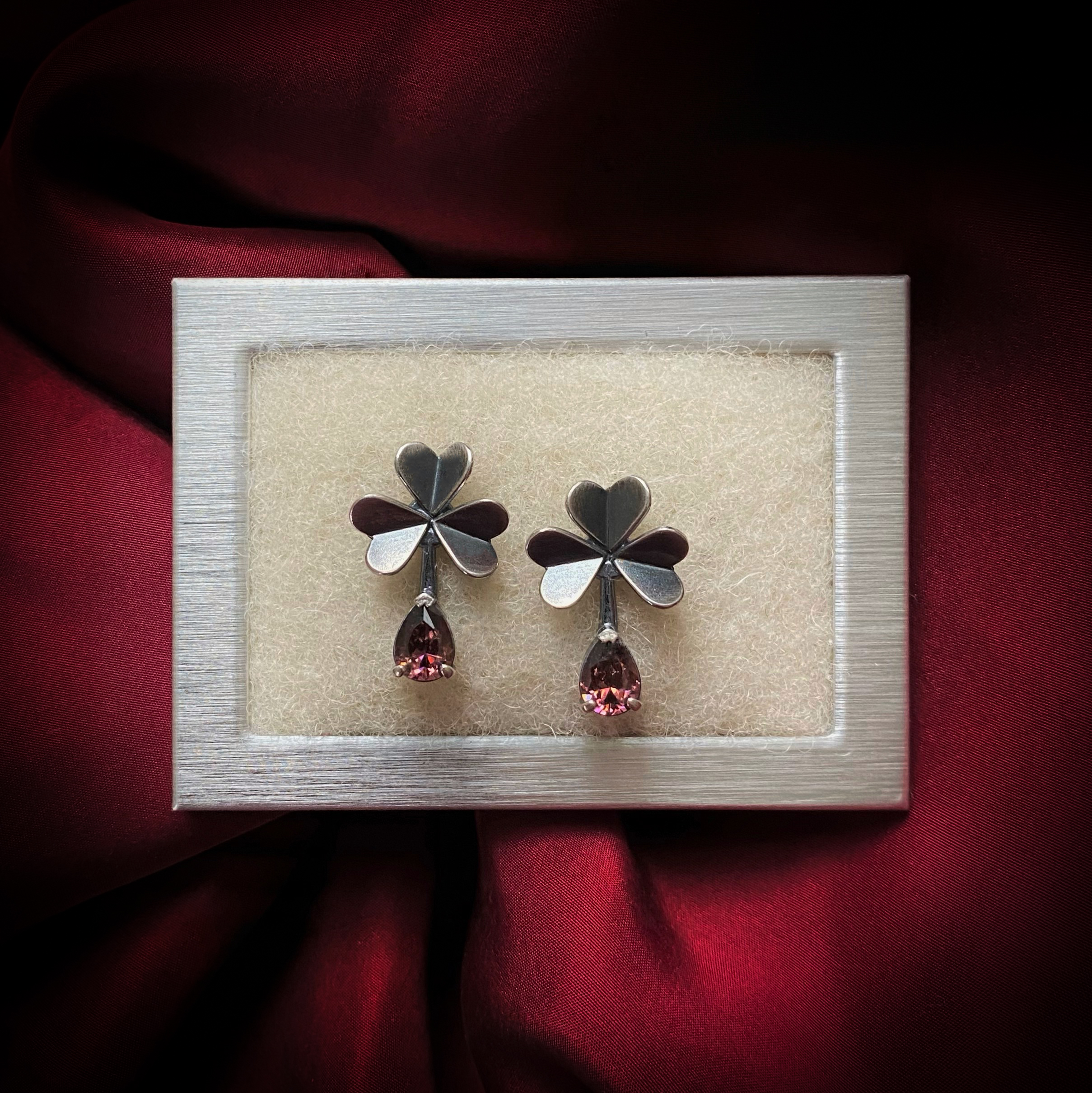 Hõbedast käsitsivalmistatud ristikheinalehed on ruumilised ja mängivad kaunilt valguse käes peegeldades erinevaid nurki. Oksüdeeritud hõbedast väikseid lehekesi täiendab särav merlot tooni kivi.