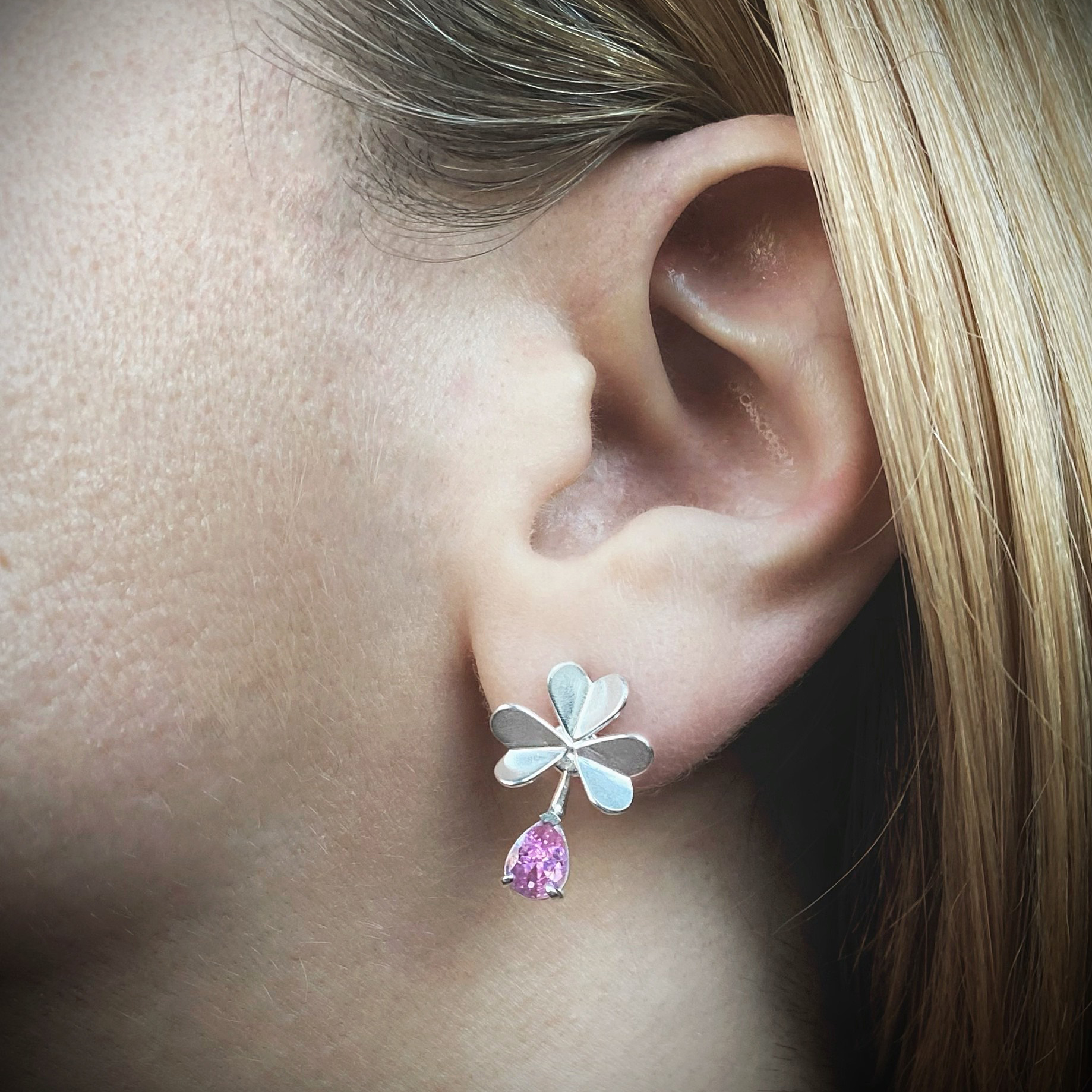 Hõbedast käsitsivalmistatud ristikheinalehed on ruumilised ja mängivad kaunilt valguse käes peegeldades erinevaid nurki. Hõbedast väikseid lehekesi täiendab särav-roosa kivi.