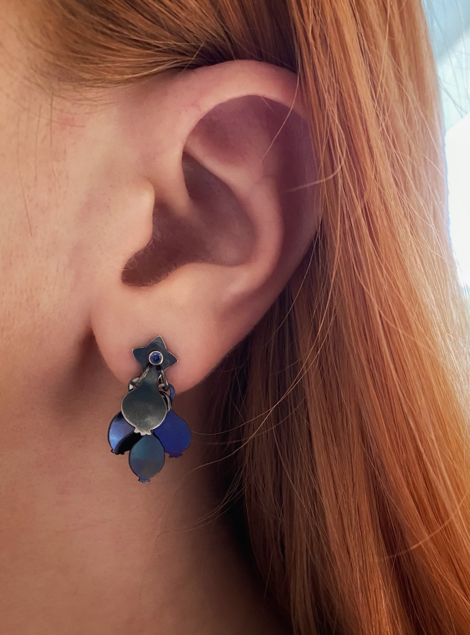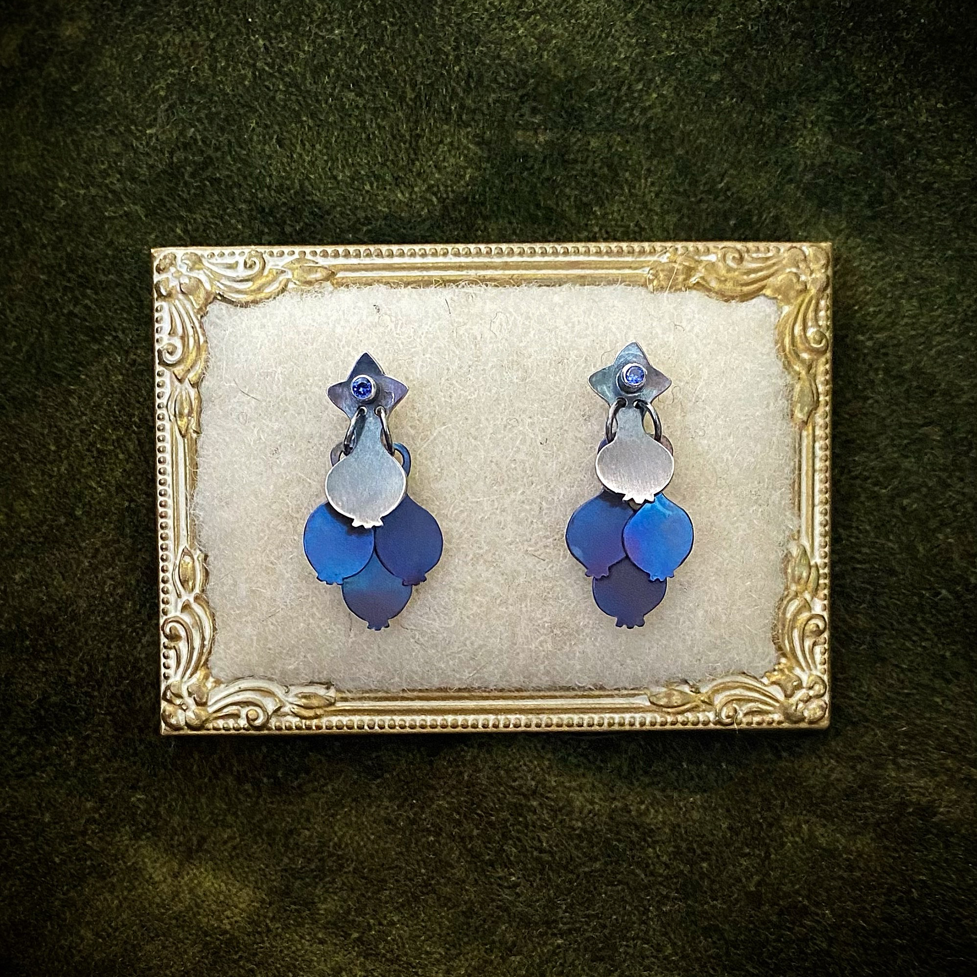 Neid armsaid käsitööna valminud mini-soomuseid, sinakalt helklevaid marjakobaraid, ehivad sinised kivid. Kaunid kõrvarõngad, mida sobib kanda pidulikematel puhkudel, kuid on samas piisavalt mugavad, et tuua sära ka argipäeva. Et sinakad detailid on valmistatud titaanist, on need ehted muljetavaldavalt kerged. Saadaval üks paar! Ehted saadetakse mustas kinkekarbis.