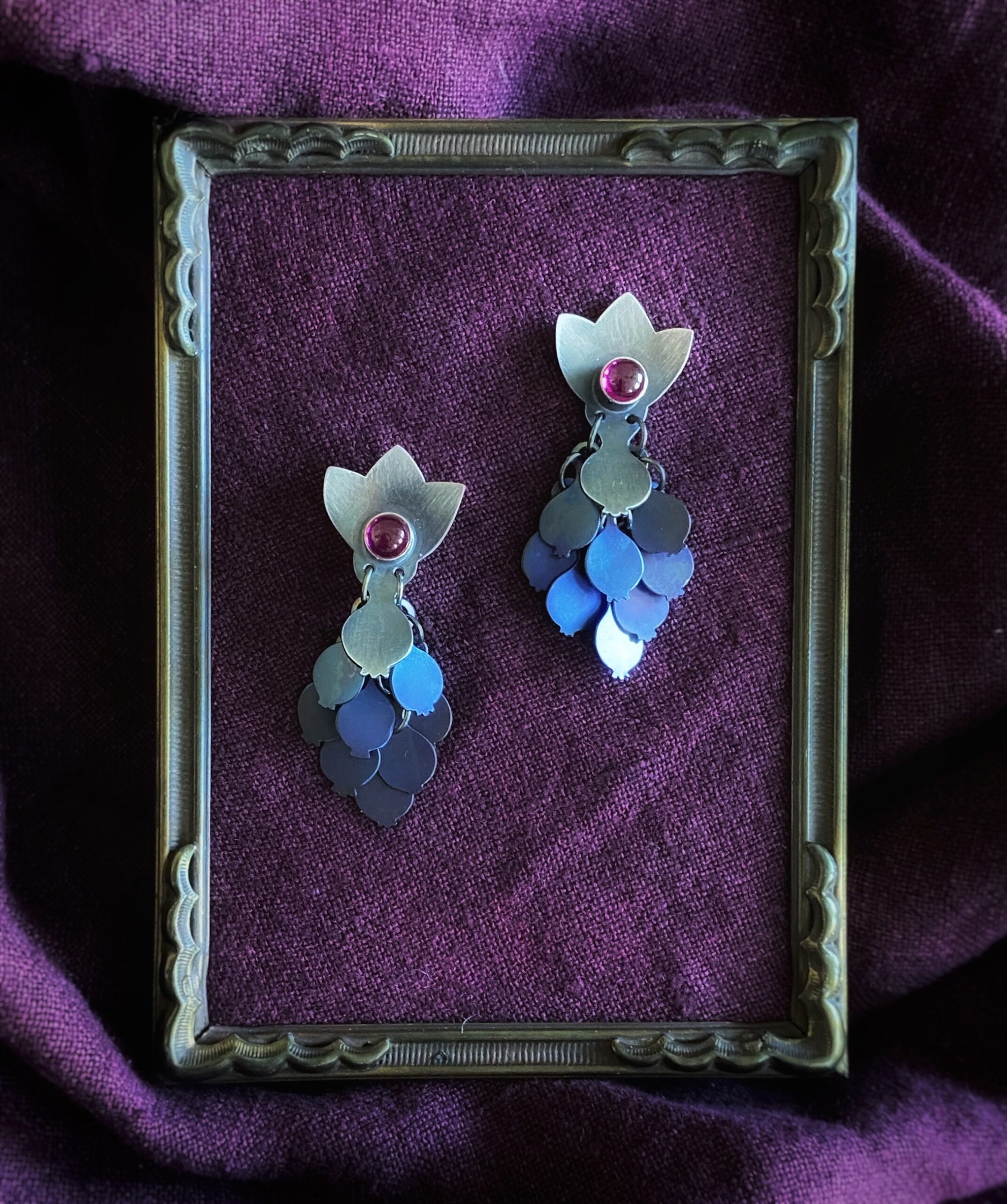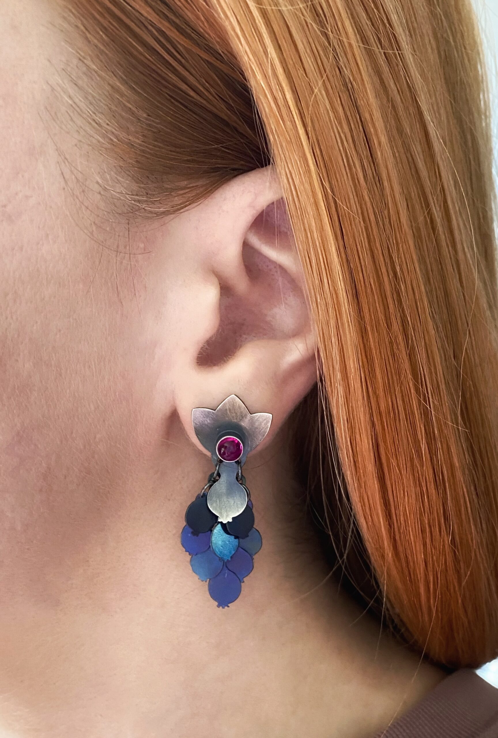 Need ‘Soomustatud’ kõrvarõngad on ainueksemplarid. Elegantsed sinakalt helklevaid marjakobaraid ehivad vaarikapunased kivid. Kaunid kõrvarõngad, mida sobib kanda ka pidulikematel puhkudel. Et sinakad detailid on valmistatud titaanist, on need ehted muljetavaldavalt kerged. ’Soomustatud’ kõrvarõngad on maitsekas lisand, mis suudab särama lüüa ka halli argipäeva. Ehted saadetakse mustas kinkekarbis.