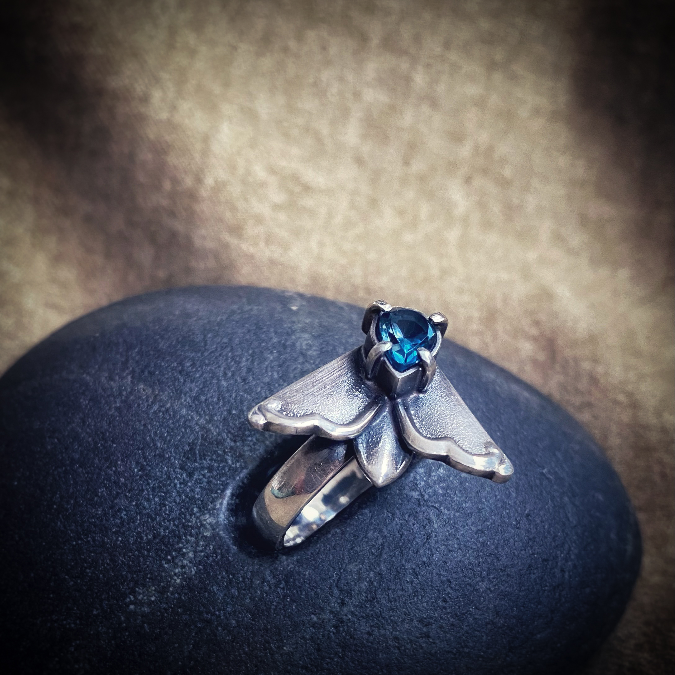 Seda ainueksemplarist ööliblikaga sõrmust ehivad antiiksete ornamentidega tiivad ning sügava tooniga naturaalne topaas. Antiik-hõbedast elemendid on leidnud uue elu läbi kunstniku nägemuse. Need ehted on trendide ja hooaegade ülesed kandes endas nii mineviku igavikulikkust kui ka tänapäevast tõlgendust. Saadaval üks sõrmus suuruses 17.
